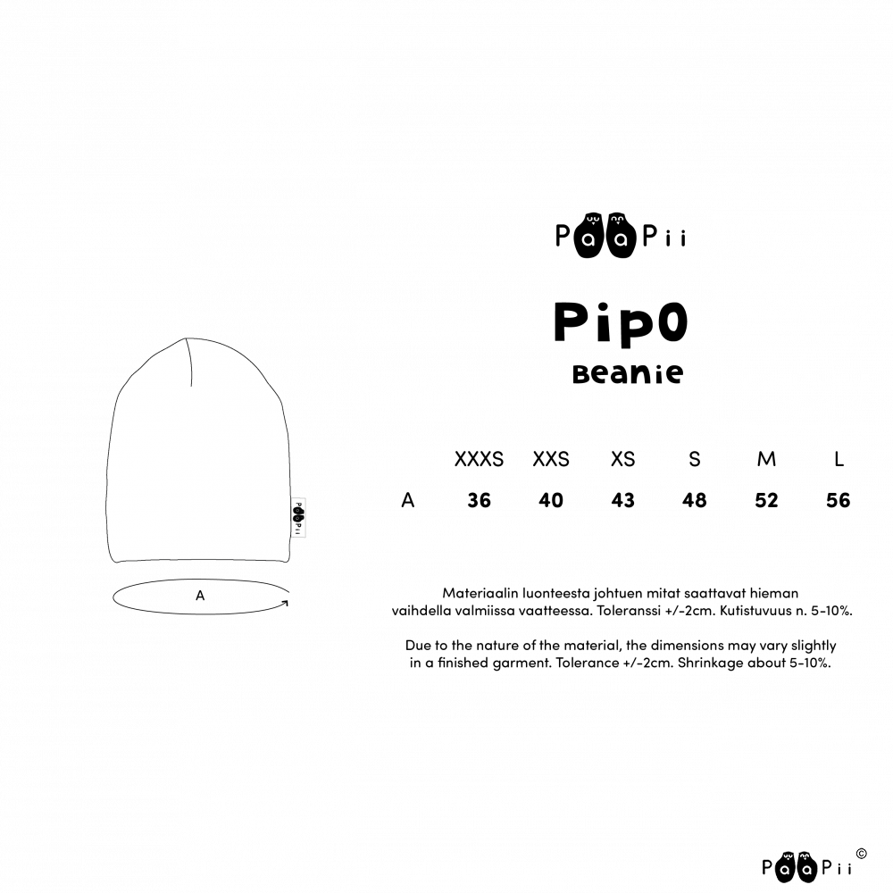 PaaPii Design pipo on malliltaan ajaton ja sopii jokaiseen päähän. Kaksinkertaista trikoota.